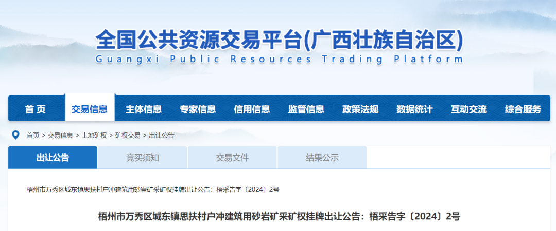 根據(jù)《自然資源部關(guān)于印發(fā)礦業(yè)權(quán)出讓交易規(guī)則的通知》(自然資規(guī)〔2023〕1號(hào))、《廣西壯族自治區(qū)自然資源廳關(guān)于印發(fā)<廣西壯族自治區(qū)礦業(yè)權(quán)交易管理辦法的通知>通知》(桂自然資規(guī)[2019]1號(hào))文件有關(guān)規(guī)定,受梧州市自然資源局委托,梧州市國(guó)土資源交易中心組織實(shí)施“梧州市萬(wàn)秀區(qū)城東鎮(zhèn)思扶村戶(hù)沖建筑用砂巖礦”采礦權(quán)掛牌出讓的具體工作,現(xiàn)將有關(guān)事項(xiàng)公告如下: