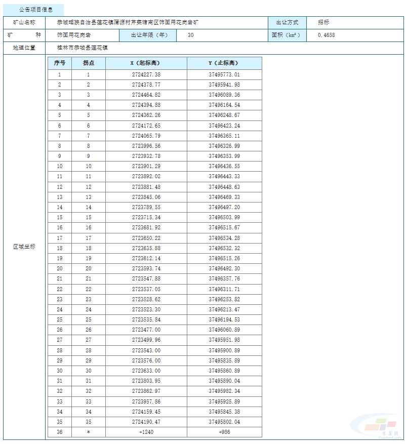 3月1日,桂林市自然資源局與桂林市公共資源交易中心聯(lián)合發(fā)布公告,招標(biāo)出讓廣西恭城瑤族自治縣蓮花鎮(zhèn)蒲源村芹菜塘南區(qū)飾面用花崗巖礦采礦權(quán),擬出讓30年,起始價1.5億元。
