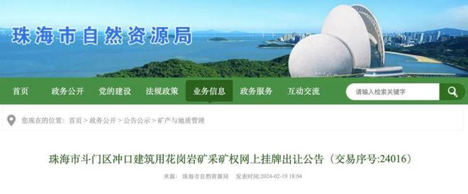 日前,珠海市自然資源局發(fā)布《珠海市斗門區(qū)沖口建筑用花崗巖礦采礦權(quán)網(wǎng)上掛牌出讓公告(交易序號(hào):24016)》。