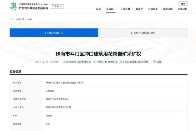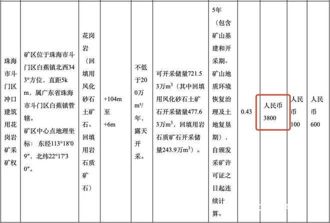 《公告》顯示,珠海市自然資源局委托珠海市公共資源交易中心(以下簡(jiǎn)稱交易中心)以網(wǎng)上掛牌方式公開出讓珠海市斗門區(qū)沖口建筑用花崗巖礦采礦權(quán),起始價(jià)為3800萬元人民幣。