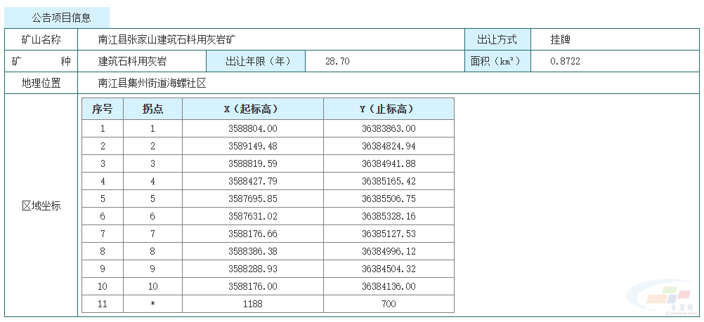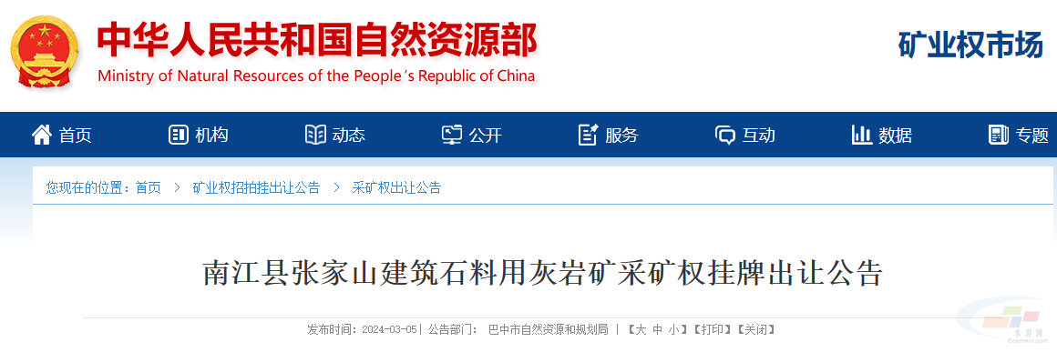 3月5日,巴中市自然資源和規(guī)劃局發(fā)布公告,掛牌出讓四川省巴中市南江縣張家山建筑石料用灰?guī)r礦采礦權(quán),擬出讓28.7年,起始價5387.42萬元。