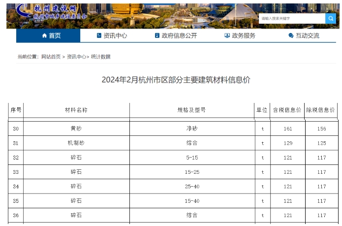 近日,杭州市城鄉(xiāng)建設(shè)委員會(huì)發(fā)布2024年2月杭州市區(qū)部分主要建筑材料信息價(jià)。2月,杭州市黃砂(凈砂)161元/噸、機(jī)制砂129元/噸、碎石121元/噸(均為含稅信息價(jià))。