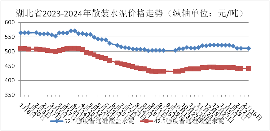 監(jiān)測數(shù)據(jù)顯示:2月份,42.5強度普通硅酸鹽水泥、42.5強度礦渣硅酸鹽水泥、52.5強度普通硅酸鹽水泥全省平均價格分別為:440.91/噸、424.05元/噸、511.00元/噸,環(huán)比分別下跌:0.90%、2.50%、1.97%;同比分別下跌:12.87%、15.09%、9.07%。具體價格走勢情況如下圖: