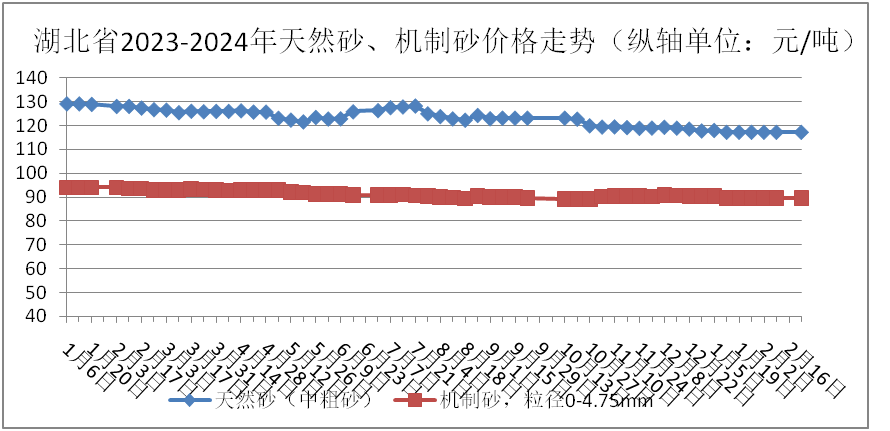監(jiān)測數(shù)據(jù)顯示:2月份,天然砂(中粗砂)、機制砂全省均價分別為117.33元/噸、89.70元/噸,環(huán)比分別下跌:0.16%、0.19%;同比分別下跌:8.08%、4.06%。具體價格走勢情況如下圖: