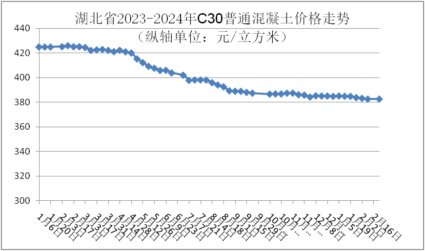 監(jiān)測數(shù)據(jù)顯示:2月份,強度等級C30普通混凝土全省均價為382.88元/立方米,環(huán)比下跌0.48%,同比下跌10.01%。