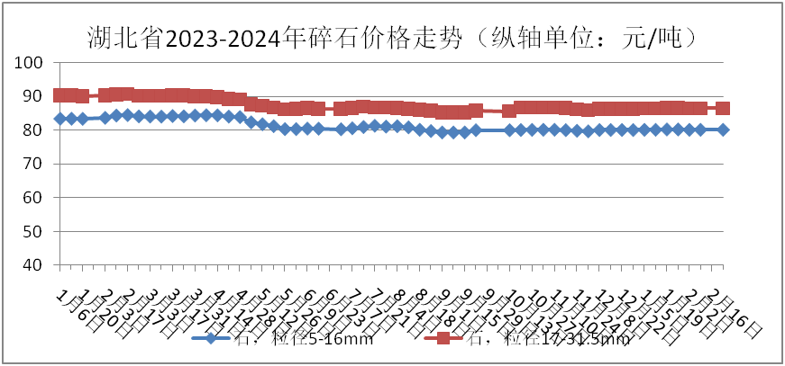 監(jiān)測數(shù)據(jù)顯示:2月份,碎石(粒徑5-16mm)、碎石(粒徑17-31.5mm)全省均價分別為80.15元/噸、86.50元/噸,環(huán)比分別下跌:0.06%、0.01%;同比分別下跌:4.76%和4.40%。具體價格走勢情況如下圖: