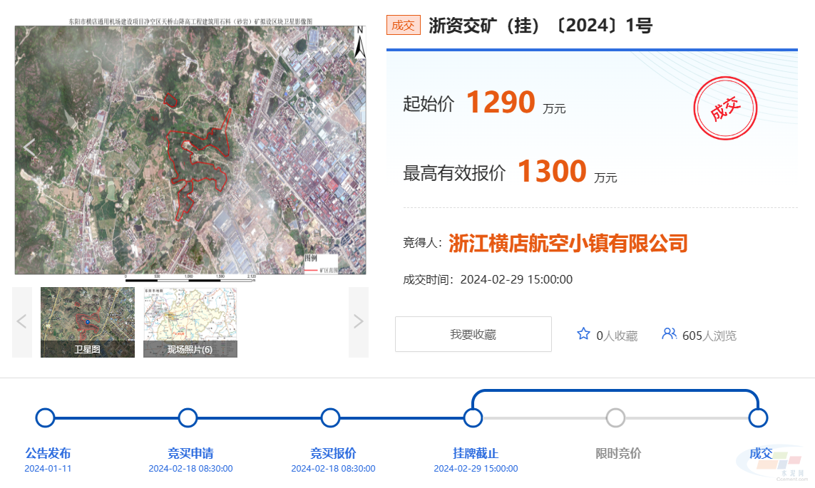 3月11日,浙江省東陽(yáng)市橫店通用機(jī)場(chǎng)天橋山建筑用石料(砂巖)礦采礦權(quán)成功出讓,擬出讓4年,年產(chǎn)246萬噸,掛牌起始價(jià)1290萬元,浙江橫店航空小鎮(zhèn)有限公司以1300萬元拿下,溢價(jià)10萬元。