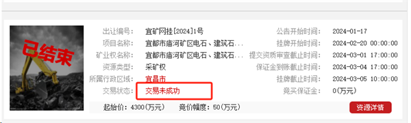 流拍的砂石礦位于湖北省宜都市,掛牌起始價(jià)4300萬元,礦區(qū)查明建筑石料用灰?guī)r礦保有資源量1390.5萬噸,生產(chǎn)規(guī)模200萬噸/年,擬出讓年限16.4年。