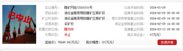 中止出讓的砂石礦位于湖北省隨州市,掛牌起始價(jià)超7.56億元,可作建筑砂石料綜合回收利用的