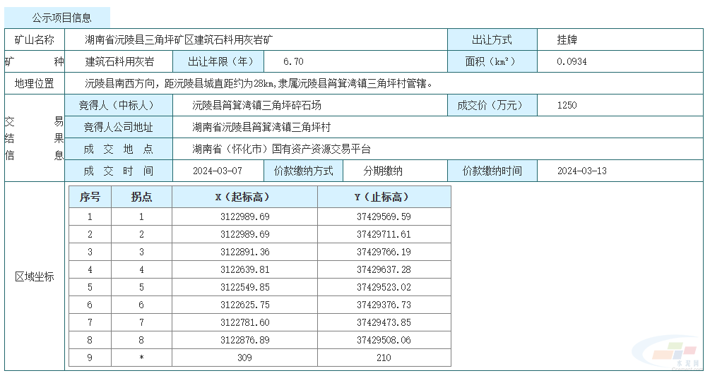 3月7日,沅陵縣筲箕灣鎮(zhèn)三角坪碎石場(chǎng)以1250萬(wàn)元拿下湖南省沅陵縣三角坪礦區(qū)建筑石料用灰?guī)r礦采礦權(quán),擬出讓6.7年,控制資源量412.29萬(wàn)噸、可采儲(chǔ)量404.1萬(wàn)噸,起始價(jià)1250萬(wàn)元。