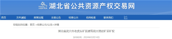 3月14日,湖北黃岡當?shù)貒?mdash;—武穴城投十里礦業(yè)有限公司成功競得武穴市老虎頭礦區(qū)建筑用大理巖礦,成交價11267.25萬元。該礦資源儲量近億噸,生產(chǎn)規(guī)模500萬噸/年,出讓年限16.3年。另外,競得人還需支付原礦業(yè)權(quán)人補償及前期費用共5676.58萬元,經(jīng)計算,該礦噸成本約1.72元。