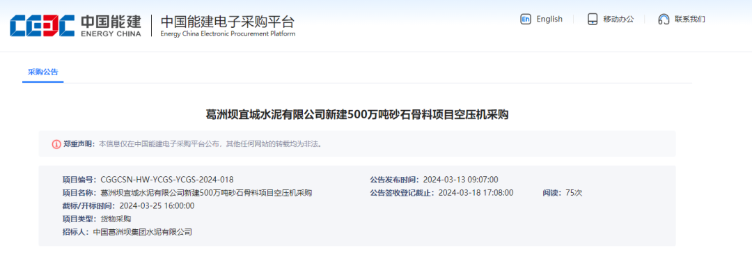 近日,中國能建電子采購平臺公示旗下葛洲壩宜城水泥有限公司新建500萬噸砂石骨料項(xiàng)目空壓機(jī)采購公告,招標(biāo)項(xiàng)目所在地湖北省襄陽市宜城市。
