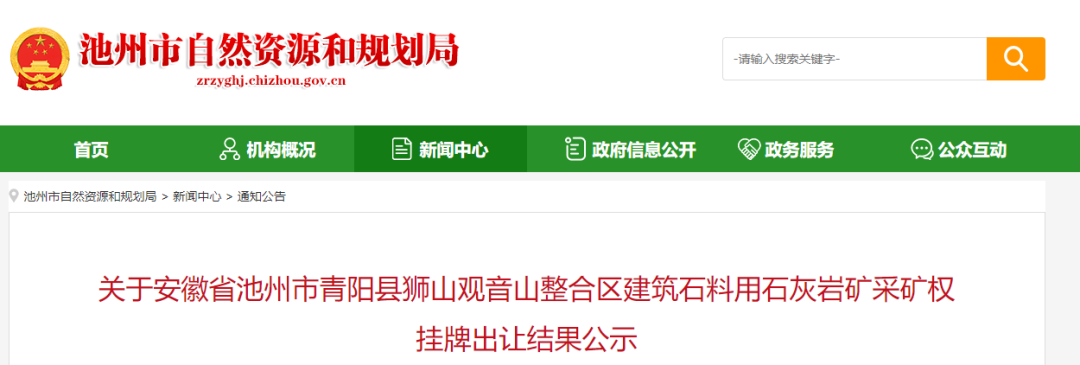 2024年3月6日至3月20日,青陽(yáng)縣自然資源和規(guī)劃局在青陽(yáng)縣公共資源交易服務(wù)中心(礦業(yè)權(quán)交易平臺(tái))對(duì)安徽省池州市青陽(yáng)縣獅山觀音山整合區(qū)建筑石料用石灰?guī)r礦采礦權(quán)公開(kāi)掛牌出讓,現(xiàn)將公開(kāi)掛牌出讓結(jié)果公示如下: