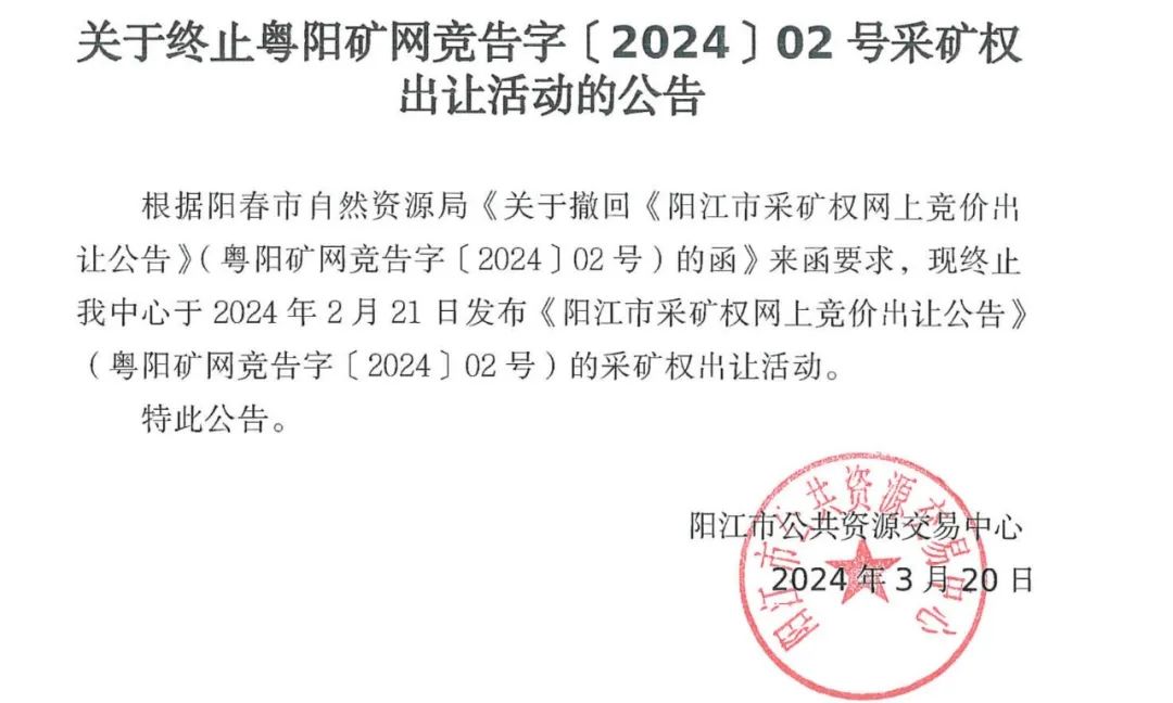 2023年12月5日,廣東云浮云城區(qū)河口街道大石嶺礦區(qū)建筑用花崗巖礦、砂質(zhì)高嶺土礦也被終止出讓?zhuān)诘诙欤?2月6日)主管部門(mén)又將其恢復(fù)正常出讓。云城區(qū)河口街道大石嶺礦區(qū)資源儲(chǔ)量10511.05萬(wàn)方,生產(chǎn)規(guī)模720萬(wàn)方/年,起始價(jià)14億元。