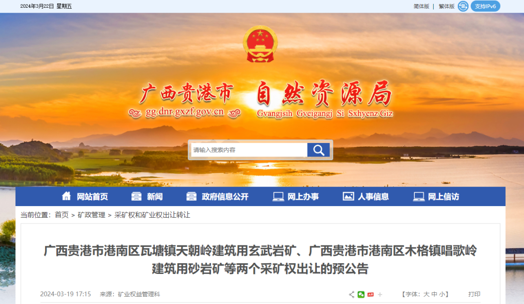 為保障園區(qū)、道路等基礎(chǔ)設(shè)施建設(shè)項(xiàng)目填方用土石需求,以及促進(jìn)玄武巖深加工產(chǎn)業(yè)發(fā)展,推動(dòng)廣西貴港市礦產(chǎn)資源高質(zhì)量發(fā)展,貴港市計(jì)劃于2024年4月-6月份通過(guò)掛牌方式出讓廣西貴港市港南區(qū)瓦塘鎮(zhèn)天朝嶺建筑用玄武巖礦和廣西貴港市港南區(qū)木格鎮(zhèn)唱歌嶺建筑用砂巖礦兩個(gè)采礦權(quán)。