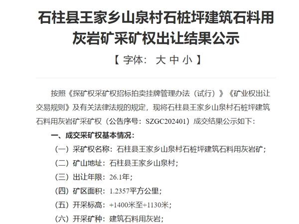 重慶市石柱縣成功出讓一宗砂石大礦。該礦開采礦種為建筑石料用灰?guī)r,資源儲(chǔ)量約3.2億噸,生產(chǎn)規(guī)模950萬噸,出讓年限26.1年,成交價(jià)約7.4億元。
