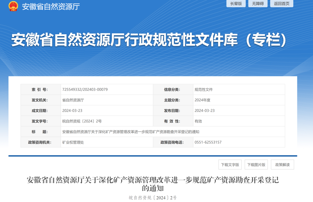 2024年3月23日,安徽省自然資源廳發(fā)布《安徽省自然資源廳關(guān)于深化礦產(chǎn)資源管理改革進(jìn)一步規(guī)范礦產(chǎn)資源勘查開采登記的通知》(以下簡稱《通知》)。