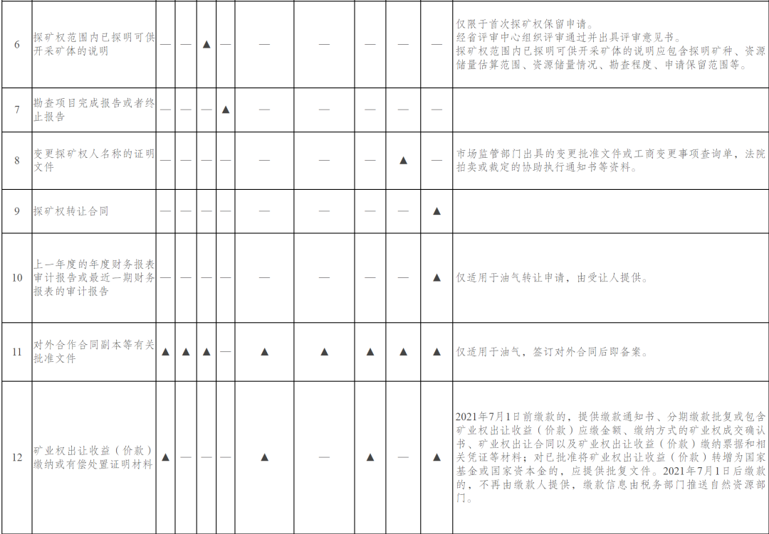 依據(jù)規(guī)范、精簡、公開的原則精簡礦業(yè)權(quán)申請資料,省級出讓登記管理的探礦權(quán)、采礦權(quán)申請資料清單及要求見附件2、3。