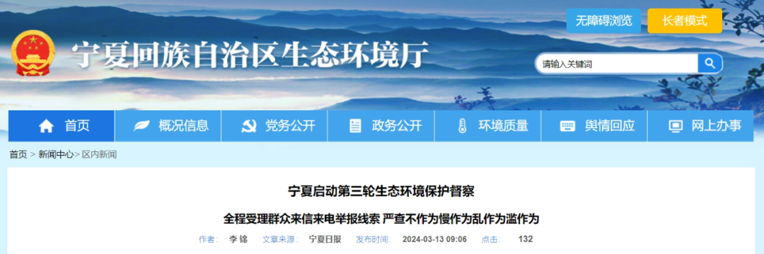 3月12日,從自治區(qū)生態(tài)環(huán)境保護督察動員部署會議上獲悉,寧夏回族自治區(qū)啟動開展第三輪生態(tài)環(huán)境保護督察。第一批次督察組3月15日前進駐石嘴山市、中衛(wèi)市、寧東能源化工基地開展督察,第二批次督察組將于6月進駐銀川市、吳忠市、固原市,每個批次督察時間不少于20天。第三輪自治區(qū)生態(tài)環(huán)境保護督察主要內(nèi)容涉及10個方面,緊盯地方黨委和政府及其有關(guān)部門生態(tài)環(huán)境保護責(zé)任落實和生態(tài)環(huán)保領(lǐng)域各項突出問題。