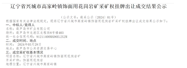近日,遼寧葫蘆島可采儲(chǔ)量近2億方(約5.6億噸)超大型花崗巖礦成功出讓。該礦生產(chǎn)規(guī)模570萬方/年(約合1539萬噸/年),出讓年限30年,成交價(jià)超8.6億元,競得人是葫蘆島市礦業(yè)有限公司,為當(dāng)?shù)貒衅髽I(yè)。
