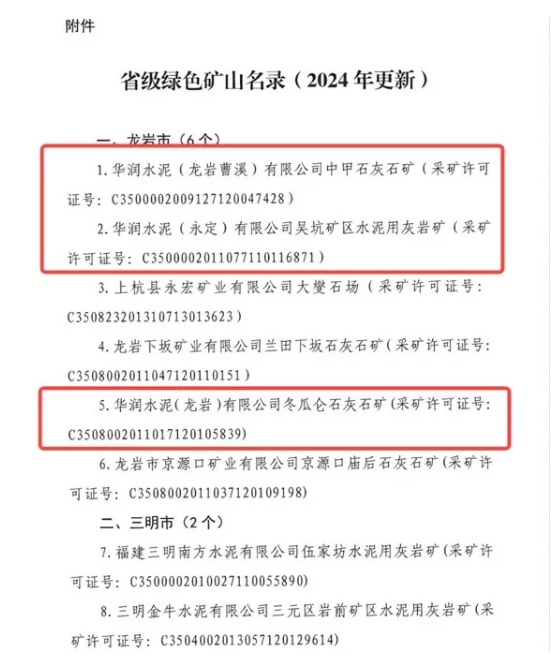 3月20日,福建省自然資源廳印發(fā)《關(guān)于更新2024年省級綠色礦山名錄的通知》,華潤建材科技東南大區(qū)龍巖曹溪水泥中甲石灰石礦、永定水泥吳坑礦區(qū)水泥用灰?guī)r礦、龍巖水泥冬瓜侖石灰石礦成功入選。