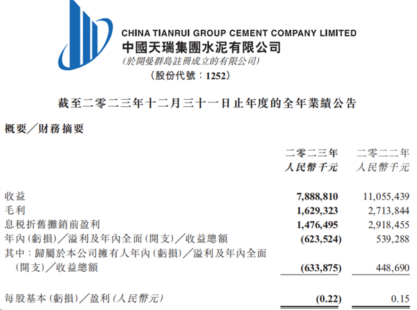 日前,中國天瑞集團(tuán)水泥有限公司發(fā)布2023年度業(yè)績報告。該集團(tuán)取得收益人民幣78.89億元,同比減少28.64%;公司擁有人應(yīng)占虧損6.34億元,去年同期則溢利4.49億元。
