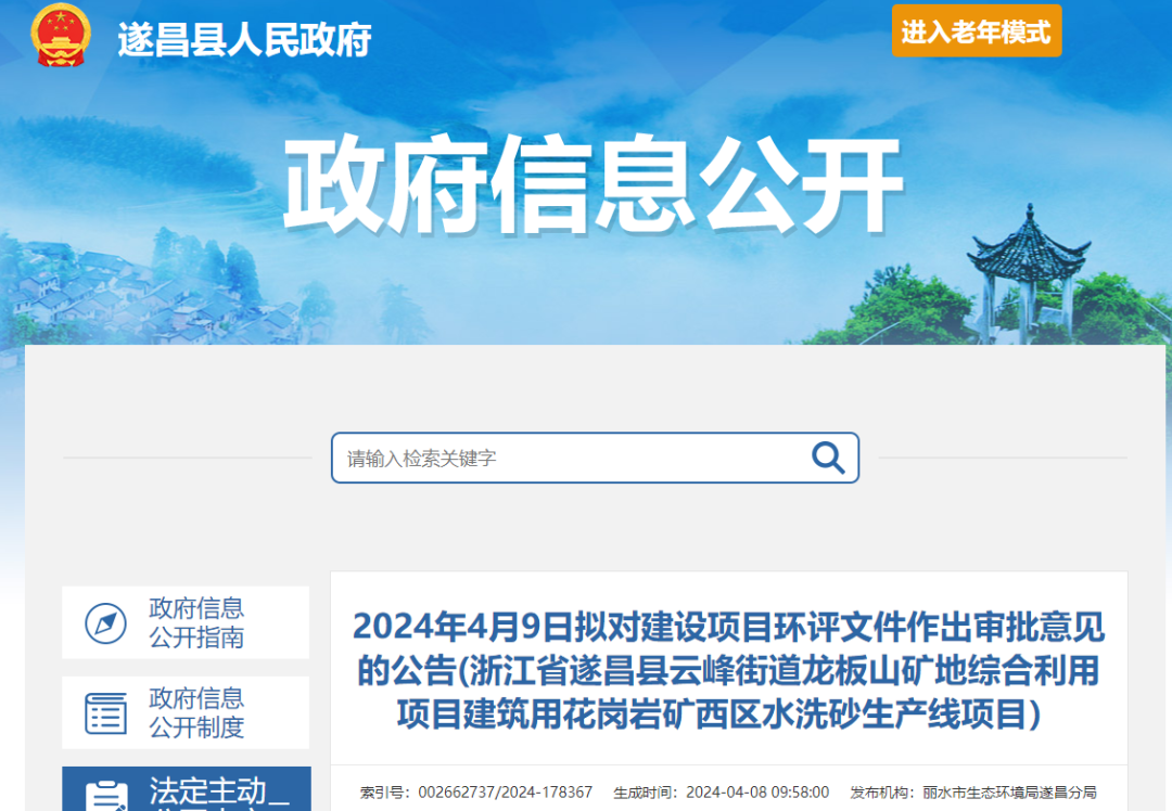 2024年4月9日擬對(duì)建設(shè)項(xiàng)目環(huán)評(píng)文件作出審批意見的公告(浙江省遂昌縣云峰街道龍板山礦地綜合利用項(xiàng)目建筑用花崗巖礦西區(qū)水洗砂生產(chǎn)線項(xiàng)目)