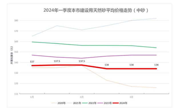 4、2024年一季度,供應(yīng)端機(jī)制砂貨源充足加上長(zhǎng)江沿線天然砂補(bǔ)充供應(yīng),建設(shè)用天然砂價(jià)格總體平緩、機(jī)制砂價(jià)格緩慢下降。經(jīng)過(guò)近幾年市場(chǎng)需求結(jié)構(gòu)發(fā)生的變化, 上海市混凝土生產(chǎn)企業(yè)對(duì)機(jī)制砂應(yīng)用的不斷完善,以及機(jī)制砂生產(chǎn)企業(yè)數(shù)量和規(guī)模逐年擴(kuò)大,滿足了 上海市建設(shè)用砂的需求,目前 上海天然砂中砂龍吳路調(diào)研價(jià)122元/噸,攪拌站開(kāi)票結(jié)算價(jià)平均134元/噸;機(jī)制砂中砂龍吳路調(diào)研價(jià)101元/噸,攪拌站開(kāi)票結(jié)算價(jià)平均111元/噸,價(jià)格已基本接近2020年一季度價(jià)格水平。