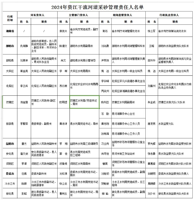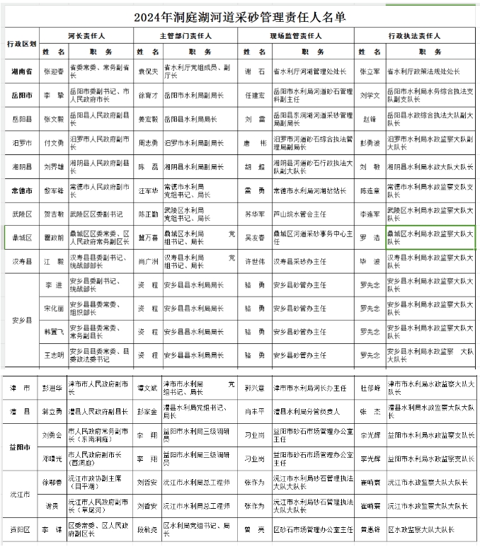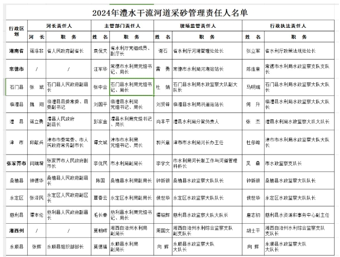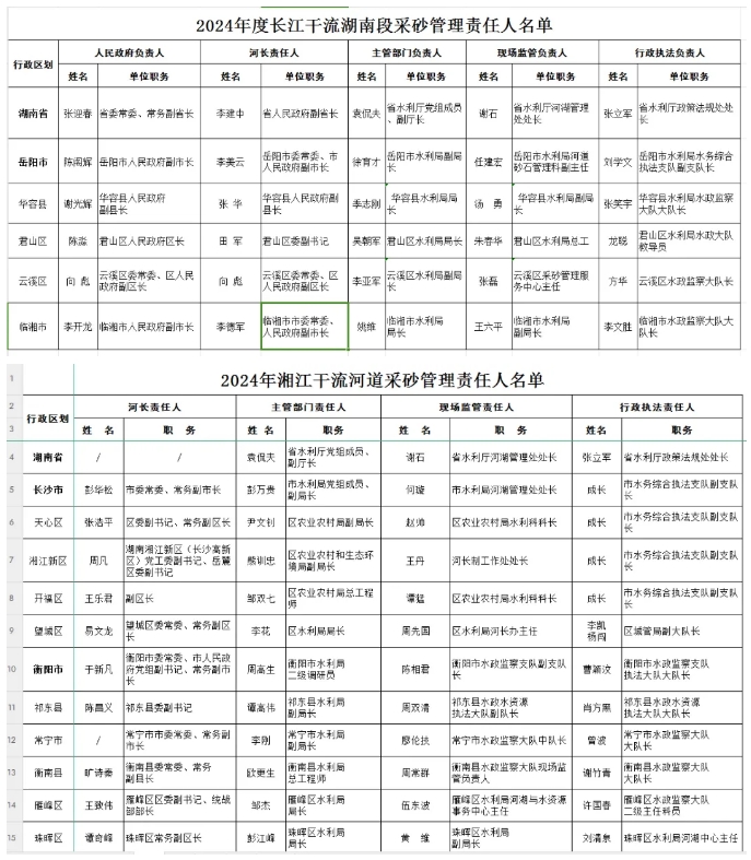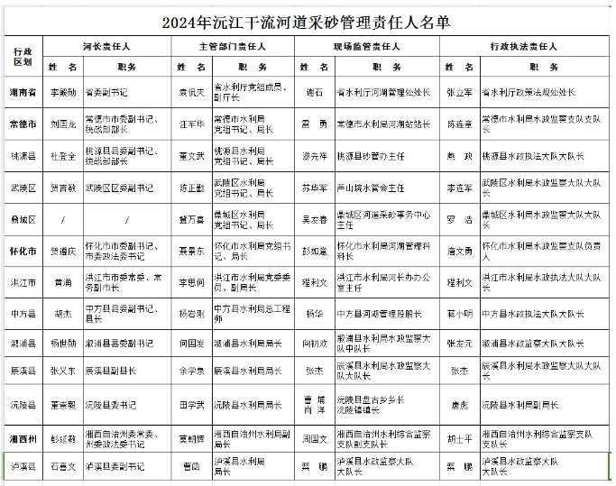 根據(jù)《長江河道采砂管理?xiàng)l例》《湖南省河道采砂管理?xiàng)l例》《水利部關(guān)于河道采砂管理工作的指導(dǎo)意見》及近期水利部、長江水利委員會關(guān)于河道采砂管理工作要求,現(xiàn)公告2024年度長江干流湖南段及湘資沅澧四水干流、洞庭湖河道采砂管理責(zé)任人名單。
