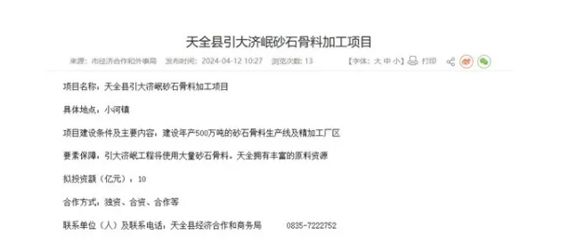 四川省雅安市天全縣引大濟(jì)岷砂石骨料加工項(xiàng)目正在招募有實(shí)力企業(yè),承擔(dān)年產(chǎn)500萬(wàn)噸的砂石骨料生產(chǎn)線及精加工廠區(qū)建設(shè)任務(wù)。據(jù)悉,該項(xiàng)目擬投資10億元,項(xiàng)目投產(chǎn)后,生產(chǎn)出來(lái)的砂石骨料產(chǎn)品主要用于保障引大濟(jì)岷工程建設(shè)需求。
