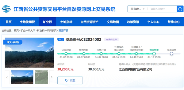 該項目位于江西省上饒市鉛山縣,開采主礦種建筑用灰?guī)r,礦區(qū)范圍內(nèi)資源儲量超1.42億噸(14232.76萬噸),開采規(guī)模570萬噸/年,擬出讓年限25.5年,掛牌起始價3.8億元。江西省興鉛礦業(yè)有限公司以3.82億元競得(交易結(jié)果待資格審核后以結(jié)果公示為準)。