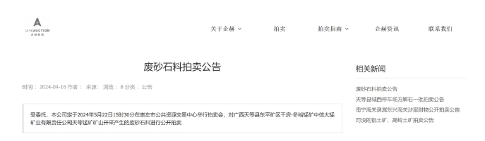 受委托,廣西企赫拍賣有限責(zé)任公司定于2024年5 月 22 日 15 時(shí)30分在崇左市公共資源交易中心舉行拍賣會(huì),對廣西天等縣東平礦區(qū)干房-冬裕錳礦、中信大錳礦業(yè)有限責(zé)任公司天等錳礦礦山開采產(chǎn)生的廢砂石料進(jìn)行公開拍賣。
