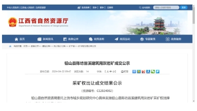 鉛山縣陳坊翁溪建筑用灰?guī)r礦采礦權(quán)出讓成交結(jié)果公示
