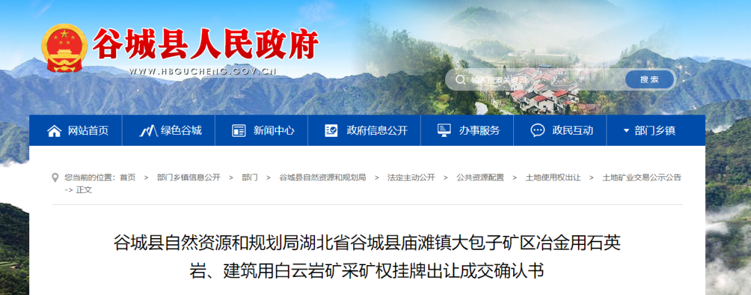 2024年4月28日,湖北谷城縣自然資源和規(guī)劃局和湖北國(guó)鑫礦業(yè)有限公司簽訂谷城縣廟灘鎮(zhèn)大包子礦區(qū)冶金用石英巖、建筑用白云巖礦采礦權(quán)掛牌出讓成交確認(rèn)書(shū),開(kāi)采區(qū)塊范圍內(nèi)建筑用白云巖總資源量為25515萬(wàn)噸。年生產(chǎn)規(guī)模520萬(wàn)噸,約1.98億元競(jìng)得。