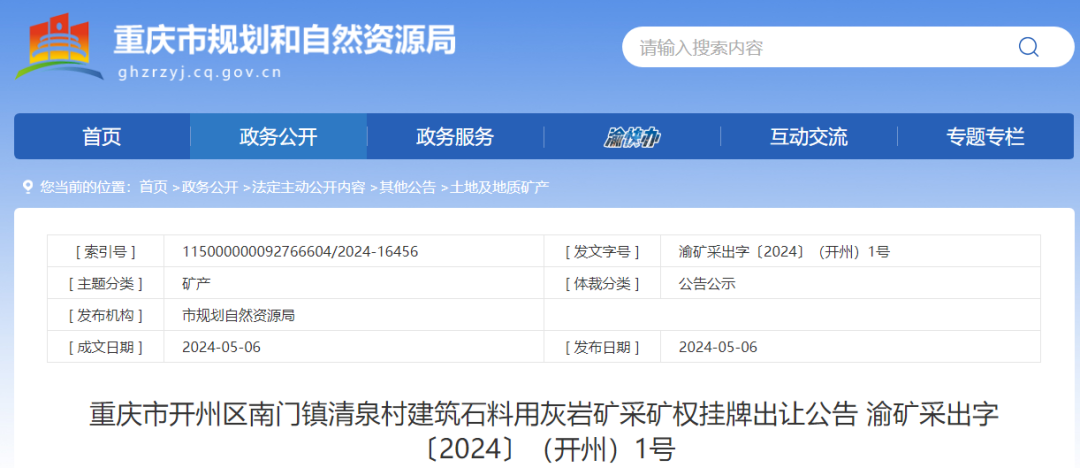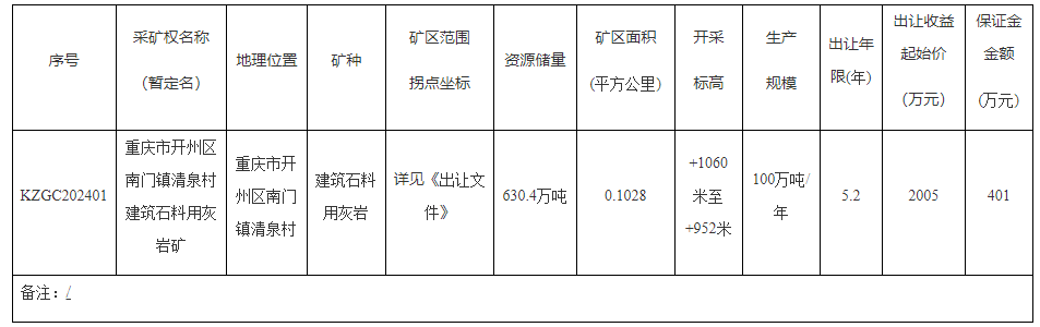 根據(jù)國(guó)家和重慶市的相關(guān)規(guī)定,重慶市開(kāi)州區(qū)規(guī)劃和自然資源局決定公開(kāi)掛牌出讓以下采礦權(quán),并委托重慶市開(kāi)州區(qū)公共資源交易中心負(fù)責(zé)公開(kāi)出讓交易環(huán)節(jié)的組織實(shí)施。現(xiàn)將有關(guān)事項(xiàng)公告如下: