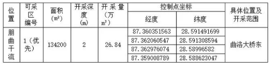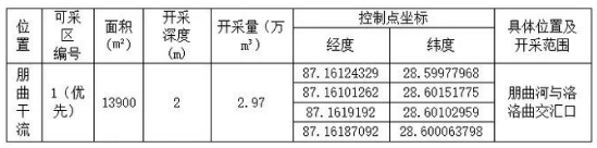 (二)定日縣曲洛鄉(xiāng)砂場(chǎng)設(shè)計(jì)開(kāi)采礦種:建筑用砂,開(kāi)采方式:露天開(kāi)采,開(kāi)采深度2m,擬出讓礦區(qū)面積約134200平方米,4個(gè)拐點(diǎn)圈定(表1-2)。評(píng)估利用資源儲(chǔ)量26.84萬(wàn)立方米,評(píng)估利用可采儲(chǔ)量25.5萬(wàn)立方米,生產(chǎn)規(guī)模5.1萬(wàn)立方米/年砂石原礦,采砂服務(wù)年限:1年6個(gè)月。