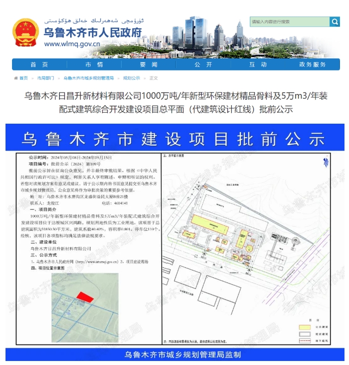 近日,烏魯木齊市人民政府公示日昌升新材料有限公司投資5.6億元年產(chǎn)1000萬噸綠色高品質(zhì)骨料線綜合開發(fā)建設(shè)項(xiàng)目總平面(代建筑設(shè)計(jì)紅線)。