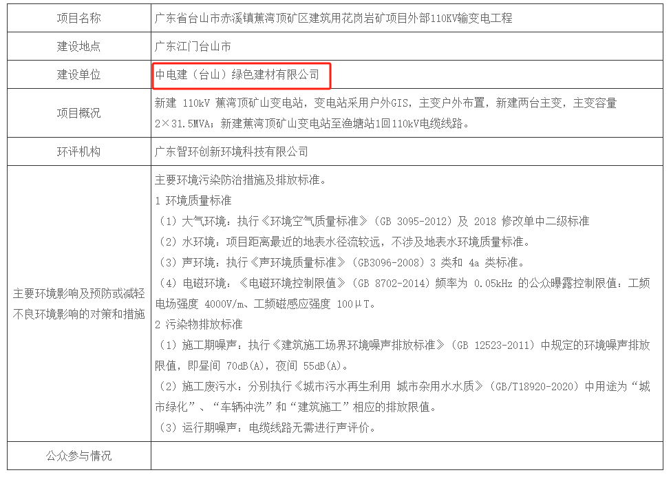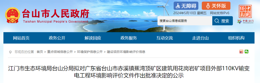 近日,江門市生態(tài)環(huán)境局臺(tái)山分局?jǐn)M對(duì)廣東省臺(tái)山市赤溪鎮(zhèn)蕉灣頂礦區(qū)建筑用花崗巖礦項(xiàng)目外部110KV輸變電工程環(huán)境影響評(píng)價(jià)文件作出批準(zhǔn)決定的公示。