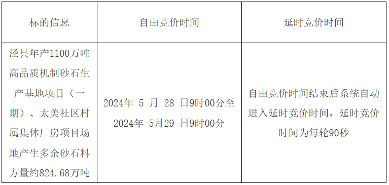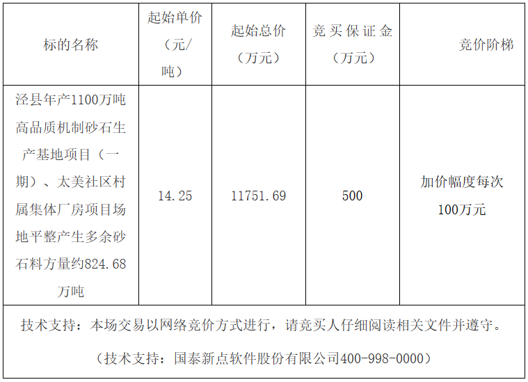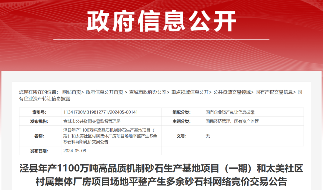 近日,安徽宣城公共資源交易監(jiān)督管理局發(fā)布涇縣年產(chǎn)1100萬噸高品質(zhì)機制砂石生產(chǎn)基地項目(一期)和太美社區(qū)村屬集體廠房項目場地平整產(chǎn)生多余砂石料網(wǎng)絡(luò)競價交易公告。