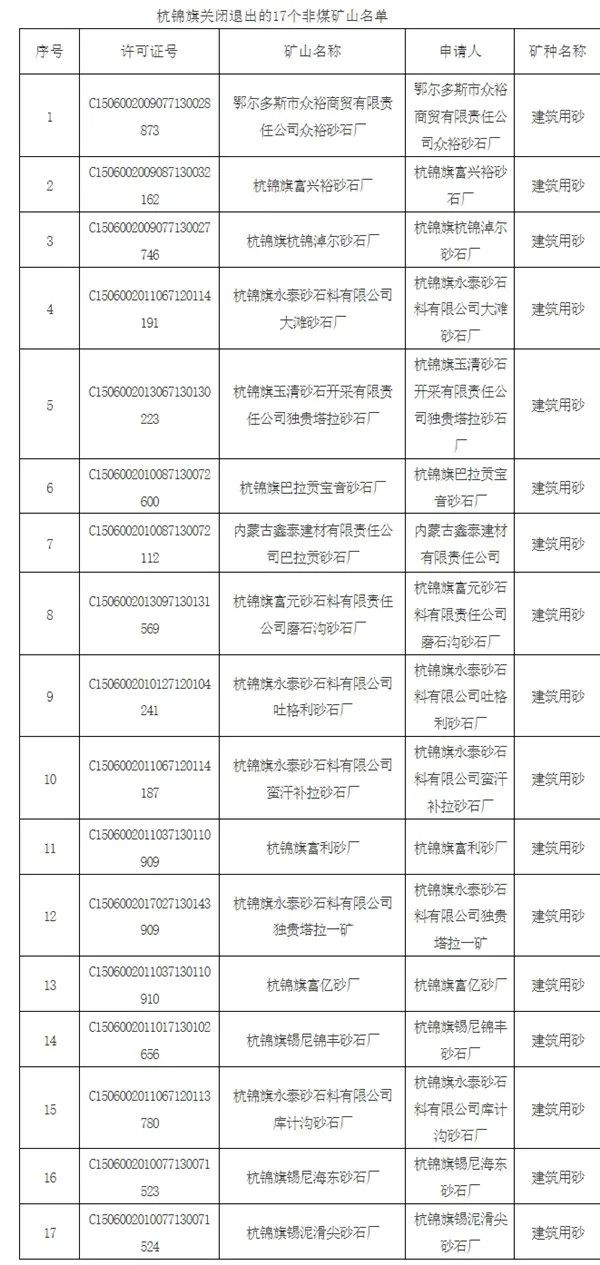 日前,內(nèi)蒙古鄂爾多斯杭錦旗人民政府發(fā)布公告稱,為深入貫徹落實習(xí)近平生態(tài)文明思想,持續(xù)打好污染防治攻堅戰(zhàn),加快解決生態(tài)環(huán)境突出問題,持續(xù)改善生態(tài)環(huán)境質(zhì)量,根據(jù)《中華人民共和國礦產(chǎn)資源法》《礦產(chǎn)資源開采登記管理辦法》《自然資源部關(guān)于進(jìn)一步完善礦產(chǎn)資源勘查開采登記管理的通知》(自然資規(guī)〔2023〕4號)及《鄂爾多斯市河長辦關(guān)于印發(fā)〈鄂爾多斯市河道采砂管理工作指導(dǎo)意見(試行)>的通知》(鄂河長辦發(fā)〔2020〕51號)要求,現(xiàn)對我旗境內(nèi)的17個非煤礦山予以關(guān)閉退出(后附名單)。