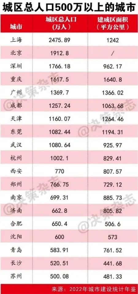 根據(jù)國務(wù)院于2014年下發(fā)的《關(guān)于調(diào)整城市規(guī)模劃分標(biāo)準(zhǔn)的通知》,城區(qū)常住人口1000萬以上的城市為超大城市,城區(qū)常住人口500萬以上1000萬以下的城市為特大城市。根據(jù)住建部發(fā)布的《2022年城市建設(shè)統(tǒng)計(jì)年鑒》,城區(qū)常住人口超過1000萬人的超大城市增至10座,分別是上海、北京、深圳、重慶、廣州、成都、天津、武漢、東莞、杭州。人口在500萬-1000萬區(qū)間的特大城市達(dá)9座,分別是西安、鄭州、南京、濟(jì)南、合肥、沈陽、青島、長沙、蘇州。