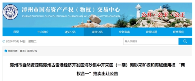 近日,福建省漳州市國有資產(chǎn)產(chǎn)權(物權)交易中心發(fā)布漳州古雷港經(jīng)濟開發(fā)區(qū)海砂集中開采區(qū)(一期)拍賣出讓公告。該項目原礦礦石量1905.06萬方,開采年限3年,起始價約2.8億元,折算14.7元/方。拍賣時間為2024年5月30日。