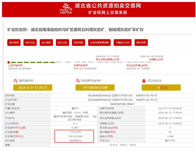據(jù)了解,湖北省南漳縣柏嶺溝礦區(qū)建筑石料用灰?guī)r礦、制堿用灰?guī)r礦采礦權(quán)掛牌出讓,擬出讓南漳縣柏嶺溝礦區(qū)范圍內(nèi)保有建筑石料用灰?guī)r礦資源量4514.0萬噸,年產(chǎn)500萬噸,出讓年限21.3 年,1.14億元起拍。