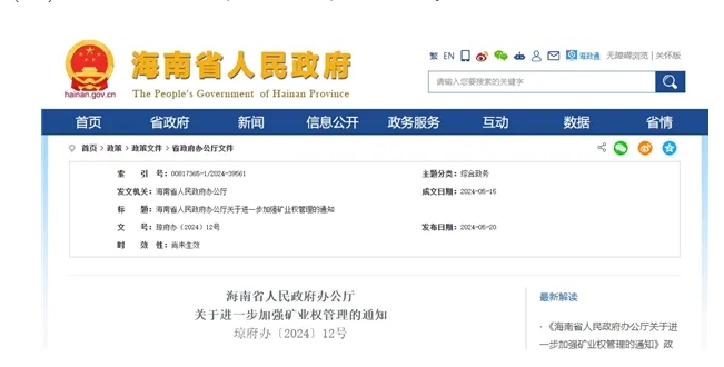 六、本通知自2024年6月18日起施行,有效期3年。《海南省人民政府辦公廳關(guān)于進(jìn)一步加強(qiáng)礦業(yè)權(quán)管理的通知》(瓊府辦函〔2020〕351號(hào))同時(shí)廢止。