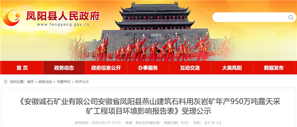 5月27日,安徽省滁州市鳳陽縣人民政府發(fā)布《安徽誠(chéng)石礦業(yè)有限公司安徽省鳳陽縣燕山建筑石料用灰?guī)r礦年產(chǎn)950萬噸露天采礦工程項(xiàng)目環(huán)境影響報(bào)告表》受理公示。