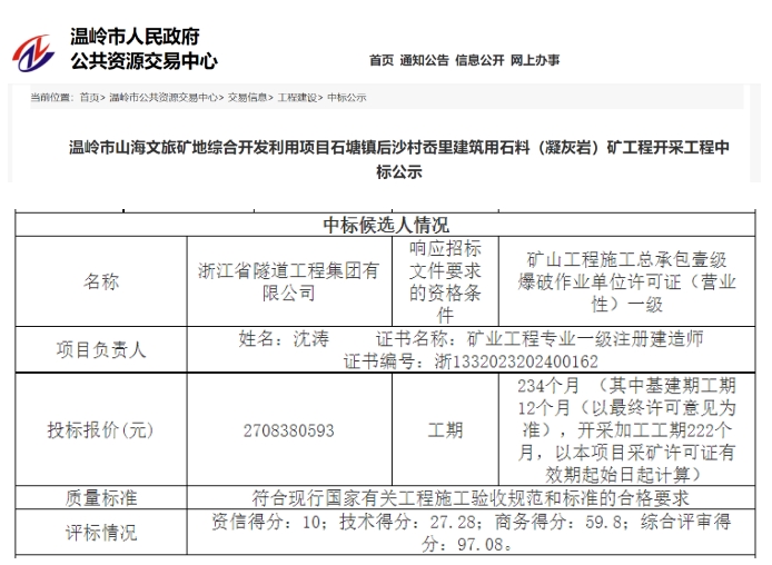 近日,浙江省溫嶺市公共資源交易中心發(fā)布臺州溫嶺市山海文旅礦地綜合開發(fā)利用項目石塘鎮(zhèn)后沙村岙里建筑用石料(凝灰?guī)r)礦工程開采工程中標(biāo)候選人。中標(biāo)候選人為浙江省隧道工程集團(tuán)有限公司,投標(biāo)報價超27億元。