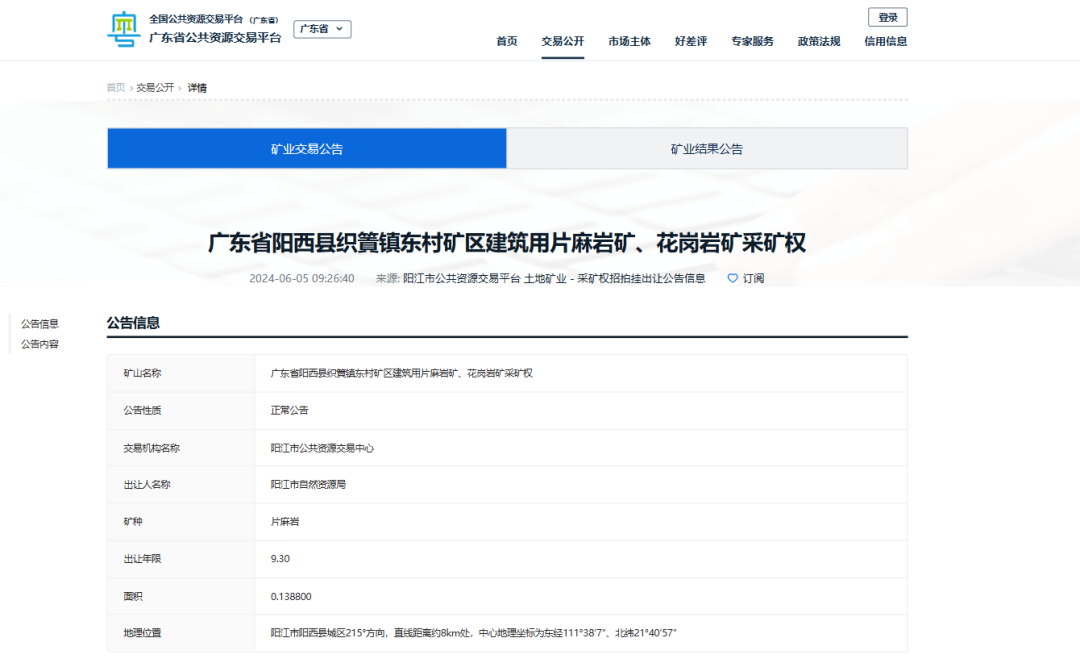近日,陽西縣自然資源局委托陽江市公共資源交易中心以網(wǎng)上競(jìng)價(jià)方式掛牌出讓1宗位于廣東省陽西縣織篢鎮(zhèn)東村礦區(qū)建筑用片麻巖礦、花崗巖礦采礦權(quán)。
