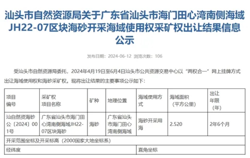 2023年9月, 廣東省汕頭市自然資源局公開出讓該海砂項(xiàng)目,起拍價12.5億元。