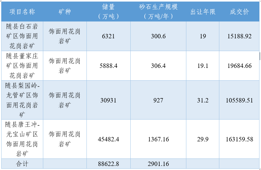 據(jù)悉,2022年7月,隨州吳聯(lián)礦業(yè)有限公司以10.56億元競得湖北省隨縣梨園嶺-龍管礦區(qū)飾面用花崗巖礦,礦區(qū)范圍內(nèi)建筑