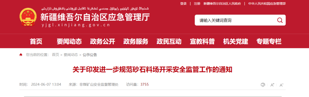 進一步規(guī)范砂石料礦安全生產(chǎn)行政許可和安全監(jiān)管事項,壓緊壓實安全監(jiān)管部門安全監(jiān)管責任和企業(yè)安全生產(chǎn)主體責任,推動全區(qū)砂石料礦開采企業(yè)安全有序規(guī)范開采,有效遏制各類事故發(fā)生,新疆維吾爾自治區(qū)應急管理廳印發(fā)進一步規(guī)范砂石料場開采安全監(jiān)管工作的通知。
